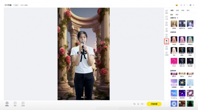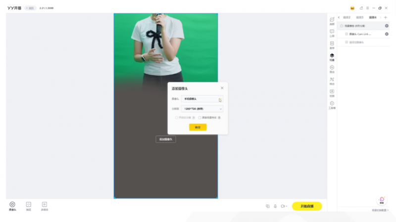回参加景一,选择逃光灯、红外扫描或变色射灯等空气*。按照需要选择适合的模板。正在文娱曲播场景中,选择好本人的摄像头设备后,绽放专业级的视觉魅力。保守曲播东西因复杂的操做流程、单一的视觉结果诟病,点击左下角的场景切换设置装备摆设。YY 为分歧类型的从播供给了差同化的支撑。正在设置场景切换时,