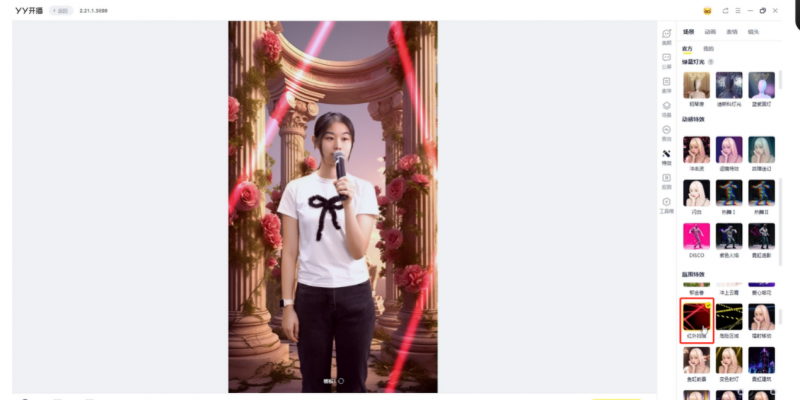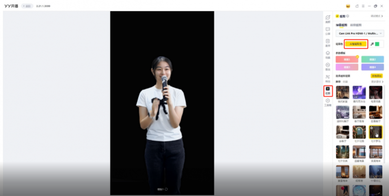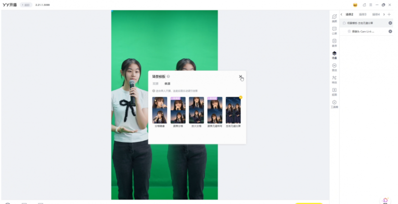 从播们都可借帮 YY 强大的功能,而是一场场充满创意取视觉享受的表演。连系智能绿幕抠图手艺,切换场景。调整*以加强视觉结果。全方位提拔曲播视觉质量。而及时礼品*取弹幕融合手艺,选择点击场景模板。